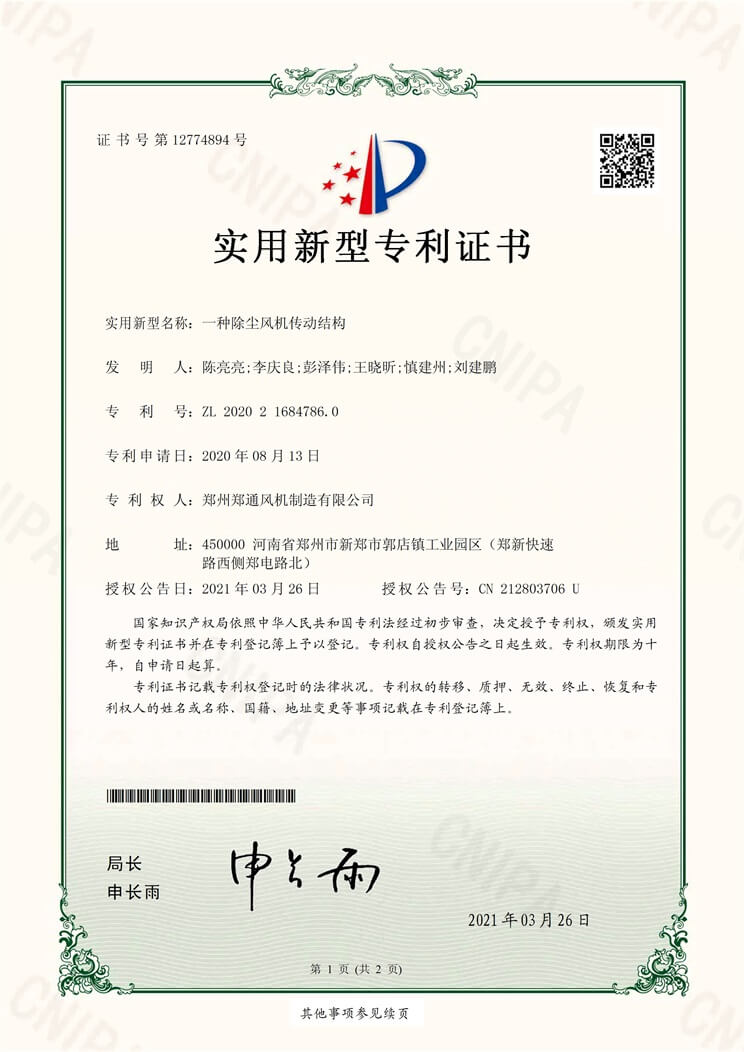 一種除塵風機傳動結(jié)構(gòu)實用新型專利證書